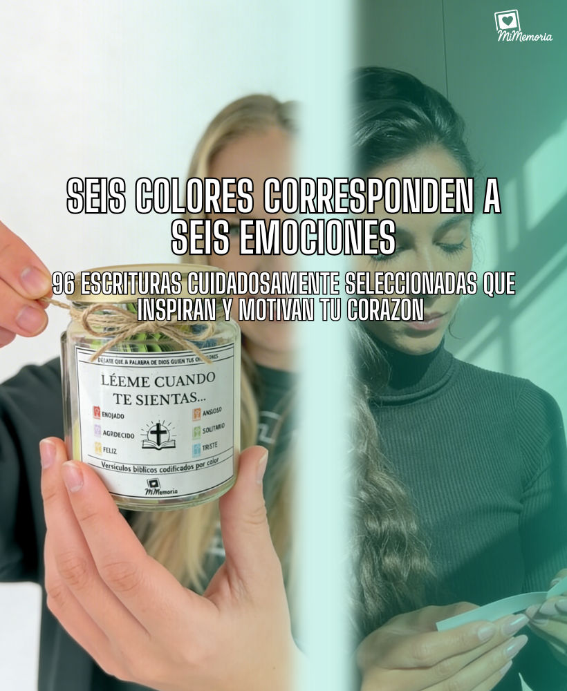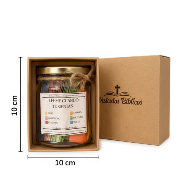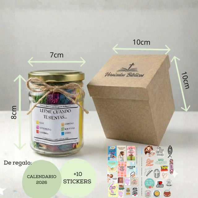 Es un frasco de vidrio que contiene 96 versículos bíblicos cuidadosamente seleccionados, impresos en papelitos listos para leer. Cada mensaje está pensado para acompañarte en distintos momentos: cuando necesitas ánimo, gratitud, paz, esperanza o fortaleza espiritual. Incluye además caja de regalo premium y extras según la edición.